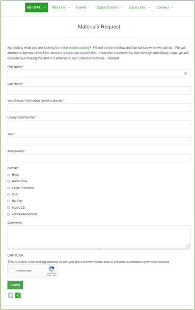 If you can’t find the title, O’Fallon Library cardholders can request it using the Materials Request link under the “My OFPL” drop-down menu.