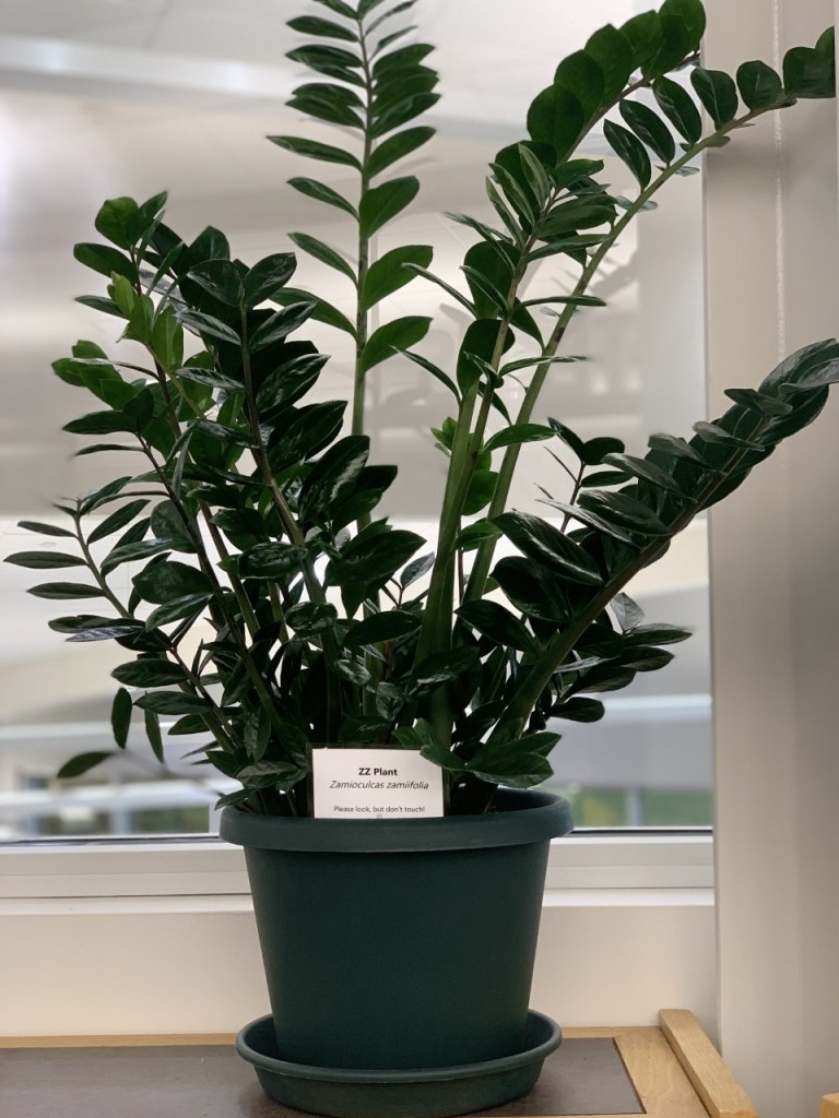 The ZZ plant almost looks fake with its perfectly almond shaped, shiny, waxy leaves that grow off thick, unbranched stems.