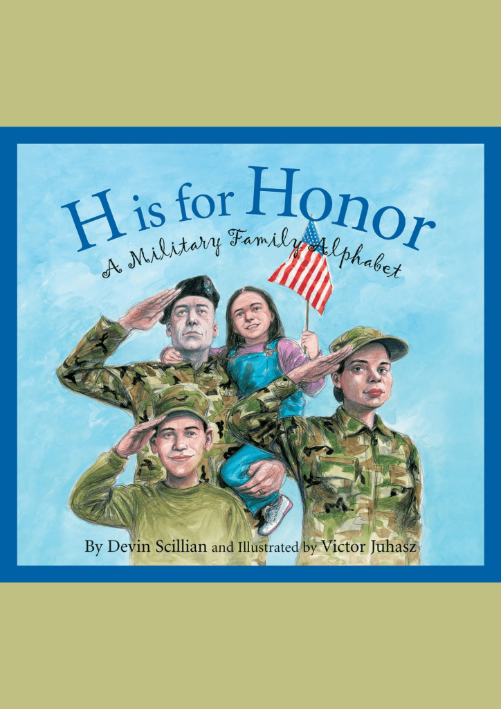 “Wherever Americans fight for freedom they very quickly learn, F‘s for the families, first and foremost, who wait for their return.” H is for Honor is a beautifully illustrated book that was written with military children in mind. It simply explains a lot of the terms they will grow up hearing. This is an excellent book for anyone wanting to learn more about military life.