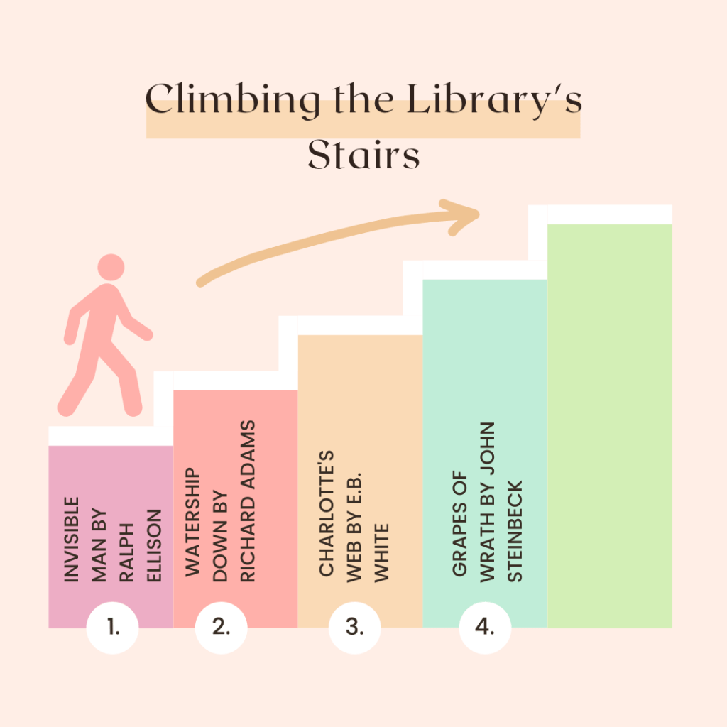 This is another entry in “Climbing the Stairs,” a collection of blog posts about the book spines painted on O’Fallon Public Library’s staircase. This month the featured title is “Grapes of Wrath” by John Steinbeck.