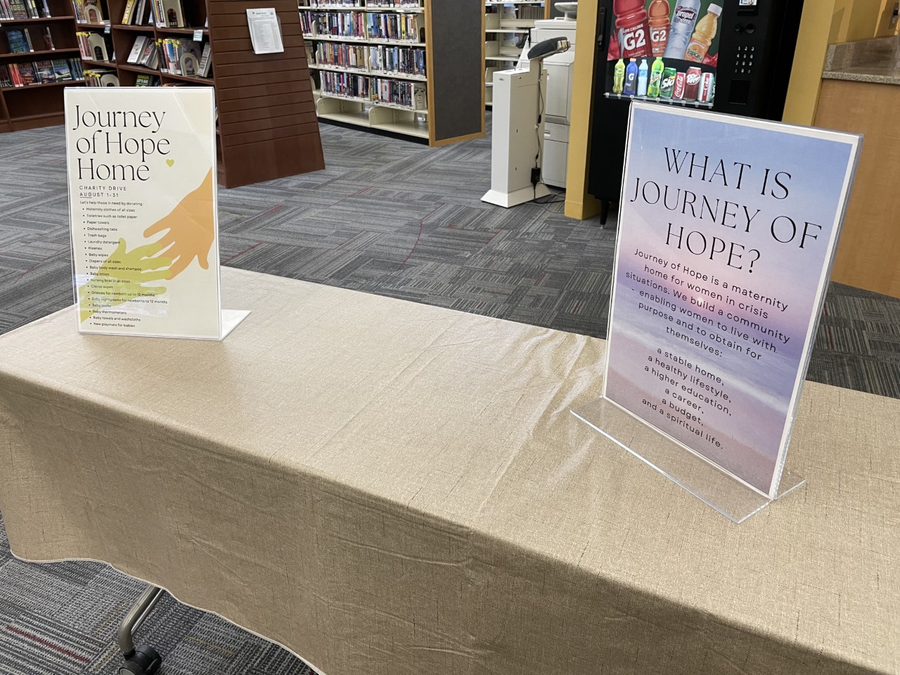 This month’s supply drive benefits Journey of Hope. The drive runs from August 1 through the 31st at the library. There is a donation table near the marketplace and vending machine. Thank you in advance for your generosity!
