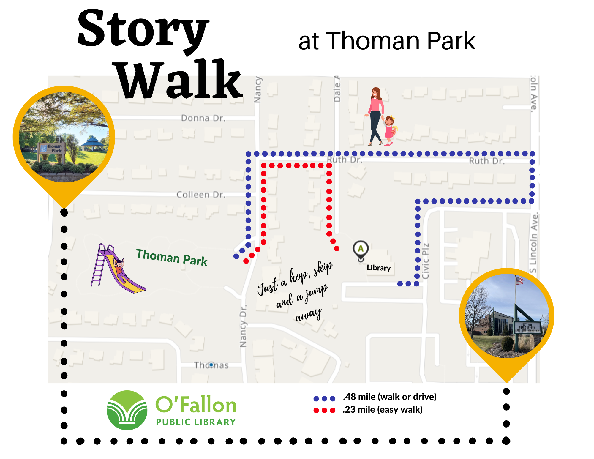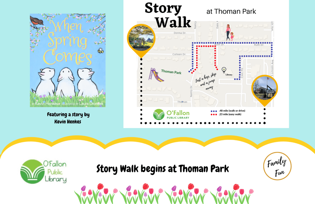Join us for a ribbon cutting ceremony on May 4, at 11:30 AM at Thoman Park. Although the walk has been available for several weeks, we will officially celebrate the positive impact the walk will have on the residents of our community. The library would like to thank the O’Fallon Parks Department for installing the kiosks, the Friends of the O’Fallon Library for their generous financial support and the city of O’Fallon for helping with printing.