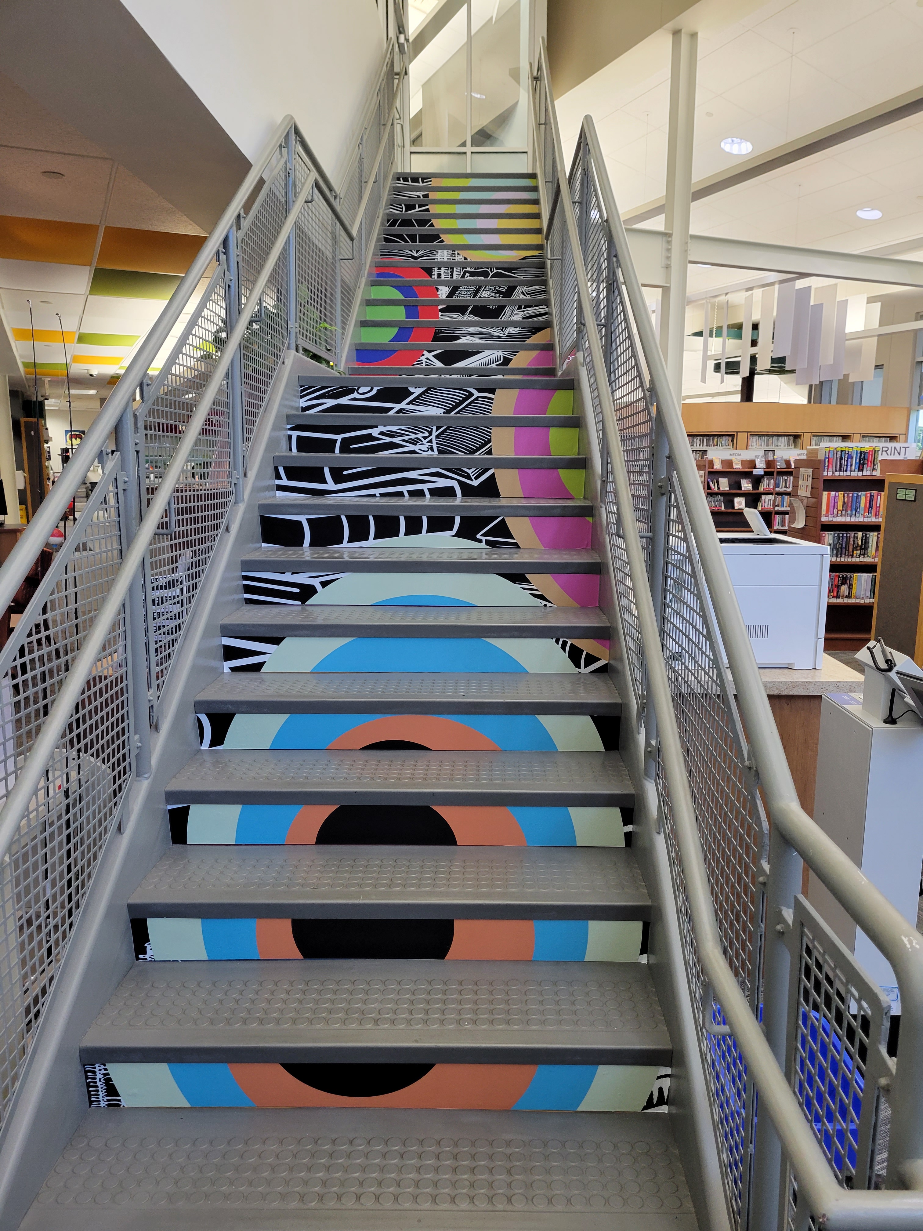 “The colors really pop against a black and white background, featuring books laid open. I especially like the rings of color near the bottom of the stairs. With the black circle in the middle, I’m reminded of an eye; open, reading, exploring,” said Library Director Ryan Johnson.