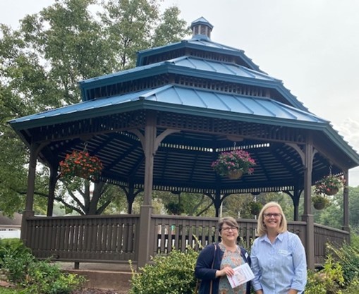 Then, we dropped in on our friends at the library in Glen Carbon. The sun was beginning to peek from behind the clouds, so we took the opportunity to snap a picture in from of their beautiful gazebo. The interior of this building is so warm and inviting. We chatted a bit with their Director, Christine Gerrish about some of the future plans for the space. We then visited with the youth services staff. Aimee, the Youth Service Director and Sam showed us around their department. What a great place for kids of all ages. Sam showed us the mural she painted in the teen room, and I must say, she is quite the artist. They shared their vision for the teen area, as they want to continue to make this a place where young people want to hang out. Their excitement was contagious. Nothing is more thrilling to this former teacher’s heart than seeing librarians who are enthusiastic about pulling kids into a space that draws them to reading!