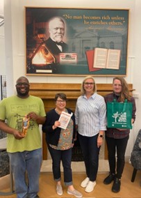 After lunch, we visited our friends at the Edwardsville library. We received such a warm welcome here from Jim, the Circulation Manager and his circulation crew! It was such fun swapping stories and catching up with some of these folks I have spoken with on the phone numerous times throughout the years. Now, I have faces to go with the names! We also had a chance to visit with the director Diane Sussman and the Social Media Coordinator, Katherine Rose.