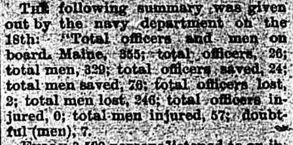 The following summary was given out by the navy department on the 18th: “Total officers and men on board Maine, 355; total officers, 26; total men, 329; total officers saved, 24; total men saved, 76; total officers lost, 2; total men lost, 246; total officers injured, 0; total men injured, 57; doubtful (men), 7.”