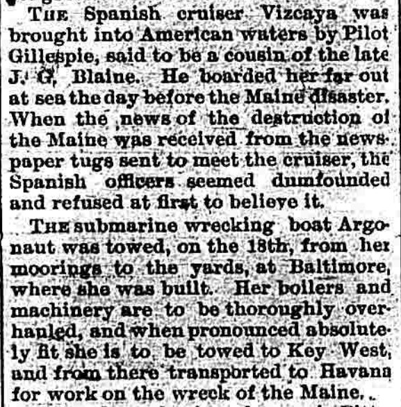 The Spanish cruiser Vizcaya was brought into American waters by Pilot Gillespie, said to be a cousin of the late J. G. Blaine. He boarded her far out at sea the day before the Maine disaster. When the news of the destruction of the Maine was received from the newspaper tugs sent to meet the cruiser, the Spanish officers seemed dumfounded and refused at first to believe it