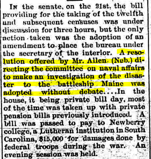In the senate, on the 21st, the bill providing for the taking of the twelfth and subsequent censuses was under discussion for three hours, but the only action taken was the adoption of an amendment to place the bureau under the secretary of the interior. A resolution offered by Mr. Allen (Neb.) directing the committee on naval affairs to make an investigation of the disaster to the battleship Maine was adopted without debate. In the house, it being private bill day, most of the time was taken up with private pension bills previously introduced. A bill was passed to pay to Newberry college, a Lutheran institution in South Carolina, $15,000 for damages done by federal troops during the war. An evening session was held.
