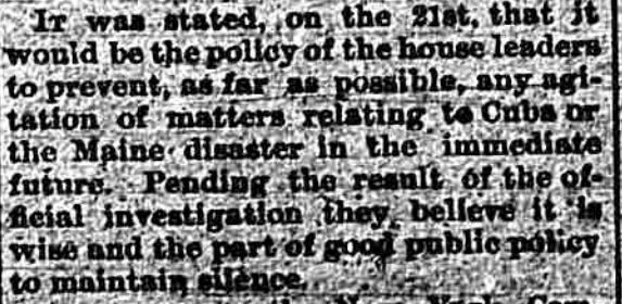 It was stated, on the 21st, that it would be the policy of the house leaders to prevent, as far as possible, any agitation of matters relating to Cuba or the Maine disaster in the immediate future. Pending the result of the official investigation they believe it is wise and the part of good public policy to maintain silence.