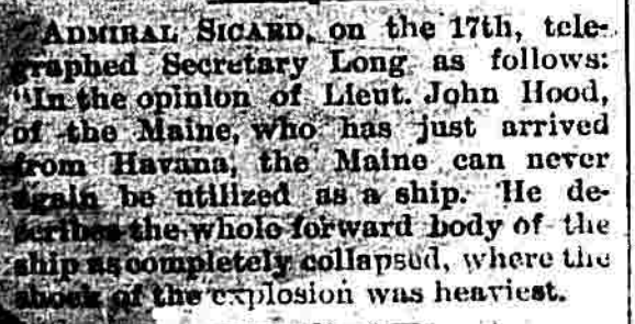 Admiral Sicard, on the 17th, telegraphed Secretary Long as follows: “In the opinion of Lieut. John Hood, of the Maine, who has just arrived from Havana, the Maine can never again be utilized as a ship.” He describes the whole forward body of the ship as completely collapsed, where the shock of the explosion was heaviest.