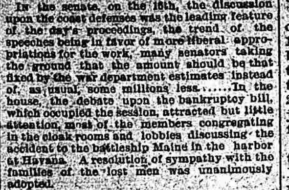 In the senate, on the 16th, the discussion upon the coast defenses was the leading feature of the day’s proceedings, the trend of the speeches being in favor of more liberal appropriations for the work, many senators taking the ground that the amount should be that fixed by the war department estimates instead of, as usual, some millions less. In the house, the debate upon the bankruptcy bill which occupied the session, attracted but little attention, most of the members congregating in the cloak rooms and lobbies discussing the accident to the battleship Maine in the harbor at Havana. A resolution of sympathy with the families of the lost men was unanimously adopted.