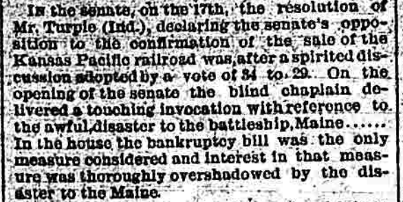 In the senate, on the 17th, the resolution of Mr. Turpio (Ind.), declaring the senate’s opposition to the confirmation of the sale of the Kansas Pacific railroad was, after a spirited discussion adopted by a vote of 34 to 29. On the opening of the senate the blind chaplain delivered a touching invocation with reference to the awful disaster to the battleship, Maine. In the house the bankruptcy bill was the only measure considered and interest in that measure was thoroughly overshadowed by the disaster to the Maine.