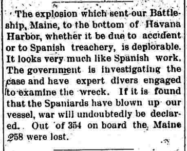 “The explosion which sent our Battleship, Maine, to the bottom of Havana Harbor, whether it be due to accident or to Spanish treachery, is deplorable. It looks very much like Spanish work. The government is investigating the case and have expert divers engaged to examine the wreck. If it is found that the Spaniards have blown up our vessel, war will undoubtedly be declared. Out of 354 on board the Maine 258 were lost.”