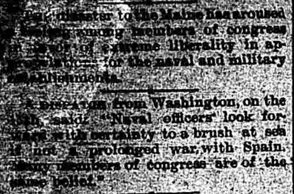 A dispatch from Washington said, “Naval officers look forward with certainty to a brush at sea if not a prolonged war with Spain. Many members of congress are of the same belief.”